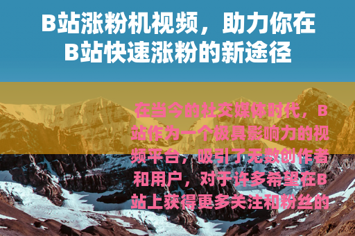 在当今的社交媒体时代,B站作为一个极具影响力的视频平台,吸引了无数创作者和用户,对于许多希望在B站上获得更多关注和粉丝的人来说,找到有效的涨粉方法是至关重要的,而B站涨粉机视频,正逐渐成为一种备受关注的方式。