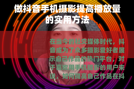 在当今的社交媒体时代,抖音成为了众多摄影爱好者展示自己作品的热门平台,对于喜欢用手机摄影的用户来说,如何提高自己作品在抖音上的播放量是一个非常关键的问题,以下是一些有效的方法,可以帮助你在抖音上让自己的手机摄影作品获得更多的关注和播放量。