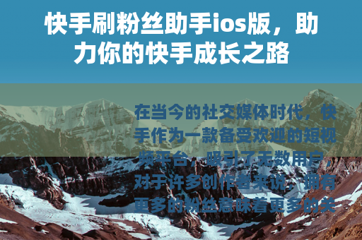 在当今的社交媒体时代,快手作为一款备受欢迎的短视频平台,吸引了无数用户,对于许多创作者来说,拥有更多的粉丝意味着更多的关注和机会,而快手刷粉丝助手ios版的出现,为他们提供了一种可能的途径来提升自己的粉丝数量。