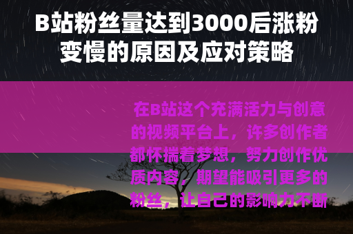 B站粉丝量达到3000后涨粉变慢是一个较为常见的现象,但创作者们不必过于焦虑,只要能够认真分析原因,并采取有效的应对措施,不断优化自己的创作和运营策略,就依然有机会实现粉丝量的持续增长,在B站这个大舞台上绽放出属于自己的光彩。