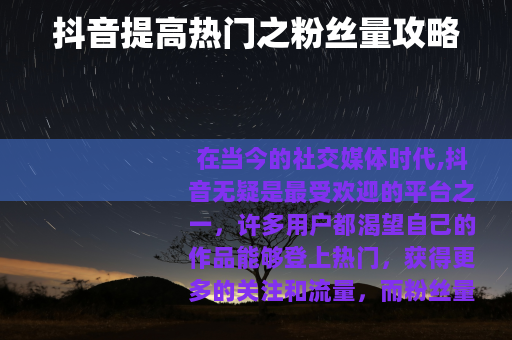 在当今的社交媒体时代,抖音无疑是最受欢迎的平台之一,许多用户都渴望自己的作品能够登上热门,获得更多的关注和流量,而粉丝量在这个过程中起着至关重要的作用,抖音如何通过粉丝量来提高热门呢?