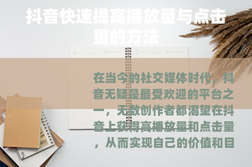 在当今的社交媒体时代,抖音无疑是最受欢迎的平台之一,无数创作者都渴望在抖音上获得高播放量和点击量,从而实现自己的价值和目标,抖音怎样才能快速提高播放数量和点击量呢?以下是一些实用的方法。 质量是关键,要确保你的视频内容具有独特性、趣味性和实用性,独特的内容能够吸引用户的注意力,让他们在众多视频中选择你的作品,你可以分享一些独家的生活小窍门、创意的手工制作或者新奇的旅游经历等,趣味性则能让用户在观看过程中感到愉悦,从而更愿意分享你的视频,实用性的内容会让用户觉得有收获,他们会更倾向于关注你的账号,以便获取更多类似的有用信息。