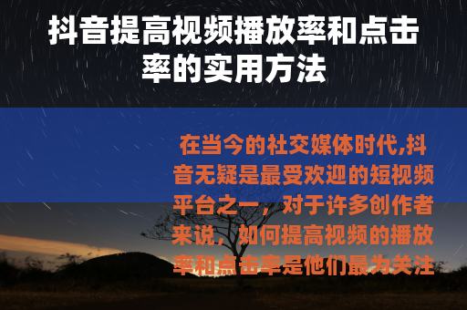 在当今的社交媒体时代,抖音无疑是最受欢迎的短视频平台之一,对于许多创作者来说,如何提高视频的播放率和点击率是他们最为关注的问题,以下是一些在抖音上提高视频播放率和点击率的有效方法。 是关键,要确保你的视频内容具有吸引力和独特性,了解你的目标受众,制作出他们感兴趣的视频,如果你面向的是年轻群体,可以制作一些潮流、娱乐、搞笑类的视频;如果是针对专业人士,那么提供有价值的知识和技能分享会更受欢迎,保持内容的新鲜感,避免重复和单调,这样才能让用户持续关注你的视频。