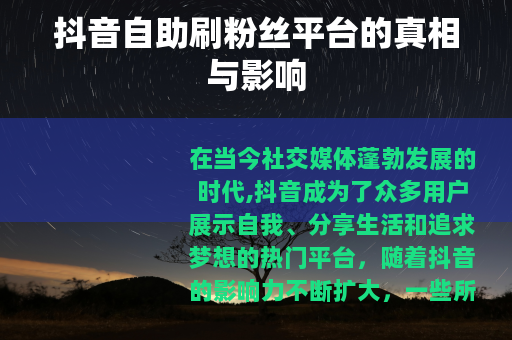 在当今社交媒体蓬勃发展的时代,抖音成为了众多用户展示自我、分享生活和追求梦想的热门平台,随着抖音的影响力不断扩大,一些所谓的抖音自助刷粉丝平台也悄然出现。
