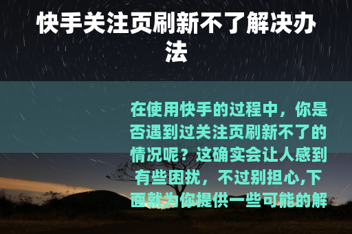 当遇到快手关注页刷新不了的情况时,不要着急,可以按照上述方法逐步排查和解决问题,让你的快手使用体验更加顺畅。