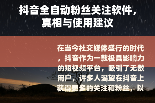 文章仅供参考,你可以根据实际需求进行调整和修改,不建议使用或推广非正规的抖音全自动粉丝关注软件,因为这可能会对用户和平台造成不良影响。