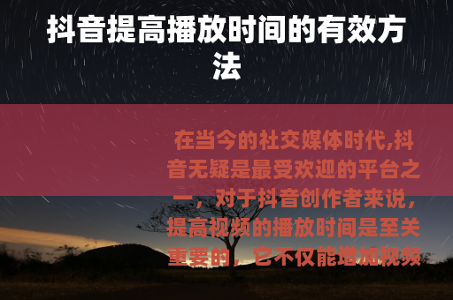 在当今的社交媒体时代,抖音无疑是最受欢迎的平台之一,对于抖音创作者来说,提高视频的播放时间是至关重要的,它不仅能增加视频的热度,还有助于账号的成长和发展,究竟该如何提高抖音视频的播放时间呢? 的吸引力是关键,要确保视频内容具有趣味性、实用性或情感共鸣,制作有趣的搞笑视频,能让用户在观看时开怀大笑,从而更愿意花时间停留;或者分享实用的生活小技巧、知识科普等内容,满足用户的求知欲,使他们想要完整地看完视频以获取更多有价值的信息。