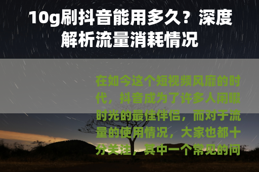 了解10g刷抖音能用多久,能让我们在享受抖音带来的乐趣的同时,也能合理地控制流量的使用,确保我们的网络生活更加顺畅和经济实惠。