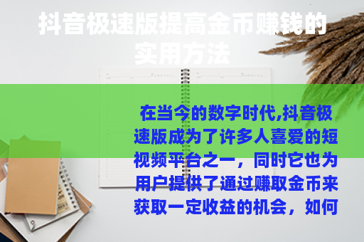在当今的数字时代,抖音极速版成为了许多人喜爱的短视频平台之一,同时它也为用户提供了通过赚取金币来获取一定收益的机会,如何在抖音极速版中提高金币赚钱的数量呢?以下是一些实用的方法。