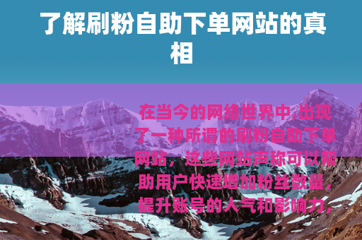 在当今的网络世界中,出现了一种所谓的刷粉自助下单网站,这些网站声称可以帮助用户快速增加粉丝数量,提升账号的人气和影响力。