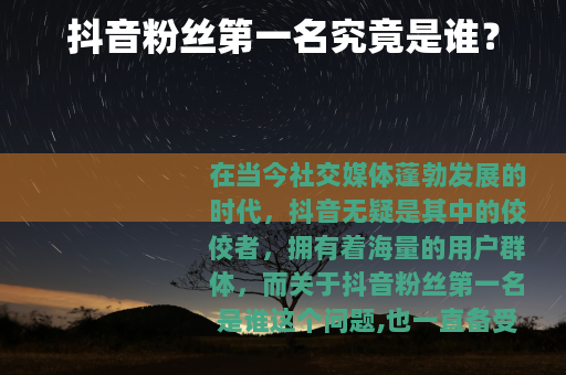 在当今社交媒体蓬勃发展的时代,抖音无疑是其中的佼佼者,拥有着海量的用户群体,而关于抖音粉丝第一名是谁这个问题,也一直备受大家的关注。