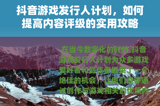 在当今数字化的时代,抖音游戏发行人计划为众多游戏爱好者和创作者提供了一个绝佳的机会,让他们能够通过创作与游戏相关的优质内容,实现流量变现和个人价值的提升,要在这个竞争激烈的计划中脱颖而出,提高内容评级是至关重要的一环,本文将为您详细介绍一些有效的方法,帮助您在抖音游戏发行人计划中提高内容评级,获取更多的流量和收益。
