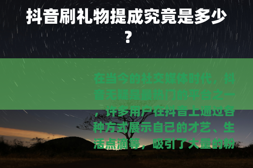 抖音刷礼物的提成多少并没有一个绝对固定的标准,它会受到多种因素的影响,包括主播的身份、与平台的合作方式以及礼物的类型等等,如果你也想在抖音上通过直播获得收益,那么了解这些提成规则是非常重要的,它可以帮助你更好地规划自己的直播策略,从而在抖音这个大舞台上实现自己的价值和收益目标。