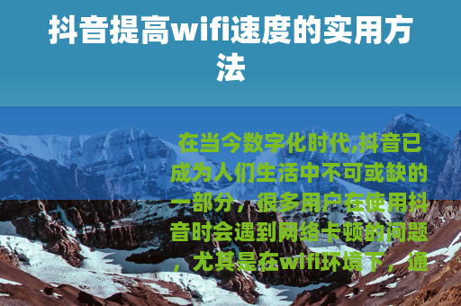 在当今数字化时代,抖音已成为人们生活中不可或缺的一部分,很多用户在使用抖音时会遇到网络卡顿的问题,尤其是在wifi环境下,通过一些简单的方法,我们可以有效地提高抖音在wifi下的运行速度,让我们能更流畅地享受抖音带来的乐趣。