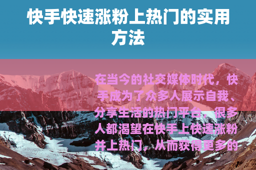 在当今的社交媒体时代,快手成为了众多人展示自我、分享生活的热门平台,很多人都渴望在快手上快速涨粉并上热门,从而获得更多的关注和机会,以下是一些切实可行的方法,帮助你在快手上实现快速涨粉上热门的目标。 质量是关键,要确保你发布的视频具有独特性、趣味性和实用性,无论是搞笑段子、美食制作教程、生活小窍门还是才艺表演,都要能吸引观众的眼球,让他们在观看后觉得有所收获或得到了快乐,如果你擅长烹饪,那么可以制作一系列详细的美食制作视频,从食材准备到烹饪过程,再到最后的成品展示,都要清晰明了,让观众能够轻松跟着学习。