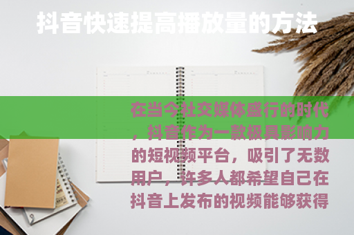 在当今社交媒体盛行的时代,抖音作为一款极具影响力的短视频平台,吸引了无数用户,许多人都希望自己在抖音上发布的视频能够获得更高的播放量,从而扩大自己的影响力和知名度,抖音怎样才能快速提高播放速度呢? 的质量是至关重要的,一个有趣、有价值、有创意的视频往往更容易吸引用户的关注,在制作视频时,要确保内容新颖独特,能够满足用户的某种需求或兴趣点,可以分享一些实用的生活小技巧、精彩的才艺表演、搞笑的段子或者是引人深思的观点等,视频的画面要清晰、稳定,音频也要清晰无杂音,这样才能给用户带来良好的观看体验。