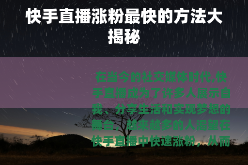 在当今的社交媒体时代,快手直播成为了许多人展示自我、分享生活和实现梦想的舞台,越来越多的人渴望在快手直播中快速涨粉,从而扩大自己的影响力和实现更多的价值,快手直播怎么涨粉丝最快呢?以下是一些行之有效的方法。
