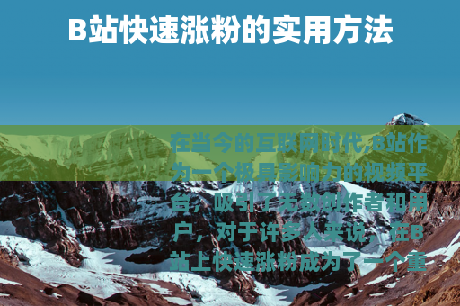 在当今的互联网时代,B站作为一个极具影响力的视频平台,吸引了无数创作者和用户,对于许多人来说,在B站上快速涨粉成为了一个重要的目标,以下是一些能够帮助你在B站快速涨粉的有效方法。 质量是关键,你需要创作出有价值、有趣且独特的视频内容,无论是搞笑、知识科普、美食制作还是游戏攻略等各种类型,都要确保你的视频能够真正吸引观众的眼球,让他们在观看后觉得有所收获或得到了娱乐,如果你擅长绘画,可以制作详细的绘画教程视频,从零基础开始教大家如何画画,这样的实用内容往往会吸引大量有相同兴趣爱好的用户关注。