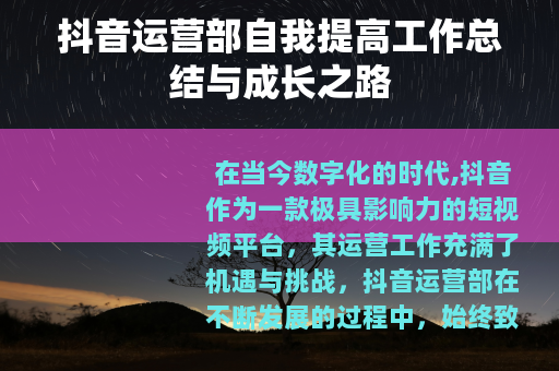 抖音运营部在自我提高的道路上不断前行,通过在内容创作、数据分析、用户互动和团队协作等方面的努力,取得了显著的成绩,在未来的工作中,我们将继续保持学习的热情和进取的精神,不断探索创新,进一步提升运营水平,为抖音平台的发展和用户的体验贡献更多的力量。 可根据实际情况进行调整和完善,希望能满足你的需求,如果你还有其他问题,欢迎继续向我提问。