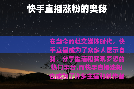 在当今的社交媒体时代,快手直播成为了众多人展示自我、分享生活和实现梦想的热门平台,而快手直播涨粉也成为了许多主播和创作者们关注的焦点话题。