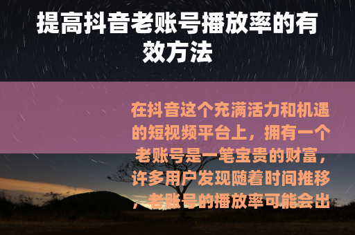 提高抖音老账号的播放率需要多方面的努力和持续的优化,只有不断提升内容质量、创新表现形式、了解受众需求、利用算法规则并保持账号活跃度,才能让老账号在抖音上重新焕发生机,获得更高的播放率和更多的关注。
