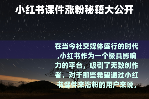 在当今社交媒体盛行的时代,小红书作为一个极具影响力的平台,吸引了无数创作者,对于那些希望通过小红书课件来涨粉的用户来说,掌握正确的方法至关重要。