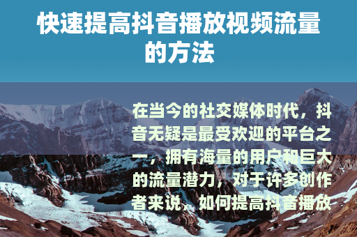 要想快速提高抖音播放视频的流量,需要从多个方面入手,不断优化自己的内容和运营策略,只有持续努力,才能在竞争激烈的抖音平台上获得更多的关注和流量,实现自己的创作目标。