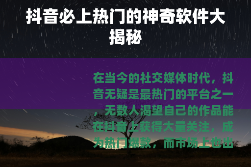 在当今的社交媒体时代,抖音无疑是最热门的平台之一,无数人渴望自己的作品能在抖音上获得大量关注,成为热门爆款,而市场上也出现了各种各样声称能让抖音必上热门的软件,今天我们就来一起了解一下这些所谓的“黑科技软件”。