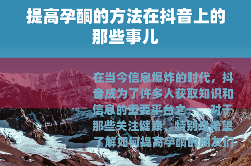 在当今信息爆炸的时代,抖音成为了许多人获取知识和信息的重要平台之一,对于那些关注健康、特别是希望了解如何提高孕酮的朋友们来说,抖音上也有着丰富多样的相关内容。
