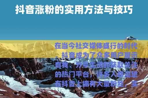 在当今社交媒体盛行的时代,抖音成为了众多用户展示自我、分享生活和获取关注的热门平台,许多人都渴望在抖音上拥有大量粉丝,实现自己的社交价值和影响力,怎么抖音涨粉呢?以下是一些有效的方法和技巧。 是涨粉的基础,要确保你的视频具有独特性、趣味性和实用性,独特的创意能够吸引用户的目光,让他们在众多视频中对你的内容产生兴趣,趣味性则可以让观众在观看过程中获得愉悦的体验,从而更愿意关注你的账号,你可以通过幽默的表演、有趣的剧情或者新奇的挑战来增加视频的趣味性,而实用性的内容,如美食制作教程、生活小妙招、学习技巧等,能够满足用户的实际需求,使他们觉得关注你的账号能获得有价值的信息。