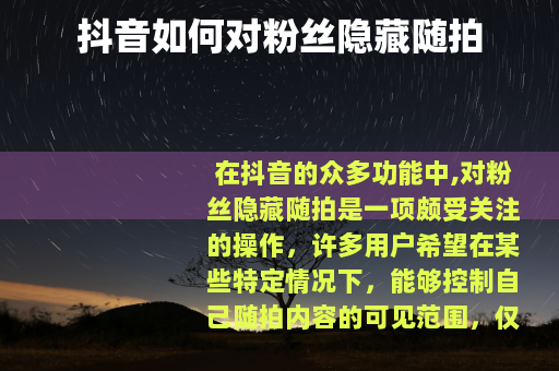 在抖音的众多功能中,对粉丝隐藏随拍是一项颇受关注的操作,许多用户希望在某些特定情况下,能够控制自己随拍内容的可见范围,仅对部分人或完全不对粉丝展示,抖音是如何实现这一功能的呢?
