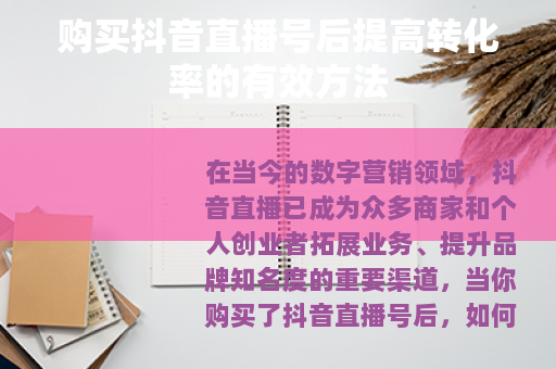 在当今的数字营销领域,抖音直播已成为众多商家和个人创业者拓展业务、提升品牌知名度的重要渠道,当你购买了抖音直播号后,如何提高其转化率就成了关键问题,以下是一些实用的方法,能帮助你在抖音直播的道路上取得更好的成绩。