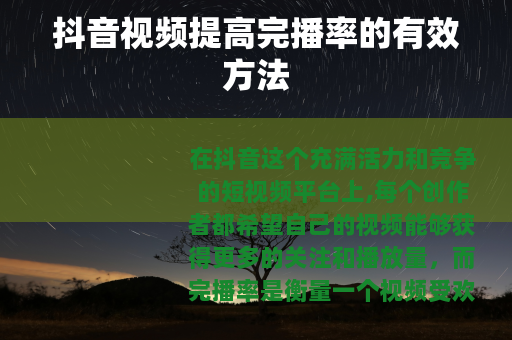 在抖音这个充满活力和竞争的短视频平台上,每个创作者都希望自己的视频能够获得更多的关注和播放量,而完播率是衡量一个视频受欢迎程度的重要指标之一,抖音视频如何有效提高完播率呢?以下是一些实用的方法。 要足够吸引人,在创作视频之前,需要深入了解目标受众的兴趣和需求,制作出能够引起他们共鸣的内容,可以是有趣的搞笑段子、实用的生活小技巧、感人的故事或者是令人惊叹的才艺展示等,只有当内容本身具有吸引力,用户才会有动力完整地看完视频。