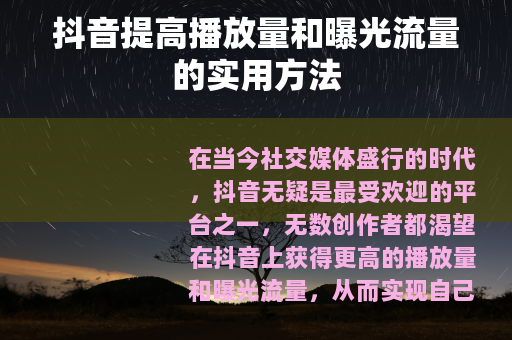 在当今社交媒体盛行的时代,抖音无疑是最受欢迎的平台之一,无数创作者都渴望在抖音上获得更高的播放量和曝光流量,从而实现自己的创作价值和商业目标,以下是一些行之有效的抖音提高播放量和曝光流量的办法。 质量是关键,要确保你的视频内容具有独特性、趣味性和实用性,独特的创意能够吸引用户的注意力,让他们在众多视频中对你的作品产生兴趣,趣味性则能让用户在观看过程中感到愉悦,增加他们分享和点赞的可能性,而实用性的内容,如知识分享、技能教学等,能够满足用户的实际需求,使他们更愿意关注你的账号并持续观看你的视频。