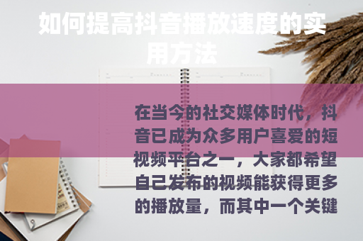 通过以上这些方法的综合运用,相信你能够有效地提高抖音视频的播放速度,让自己的作品在抖音这个庞大的平台上获得更多的关注和喜爱,不断尝试和优化,你会在抖音创作的道路上取得更好的成绩。