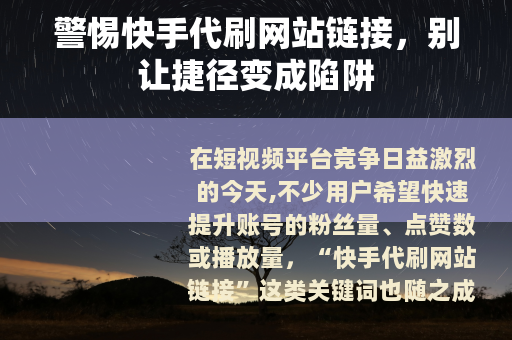 在短视频平台竞争日益激烈的今天,不少用户希望快速提升账号的粉丝量、点赞数或播放量,“快手代刷网站链接”这类关键词也随之成为一些人的搜索目标,看似能“一步登天”的代刷服务,背后却藏着诸多风险与隐患,甚至可能让你得不偿失。