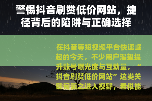 在抖音等短视频平台快速崛起的今天,不少用户渴望提升账号曝光度与互动量,“抖音刷赞低价网站”这类关键词随之进入视野,看似能快速解决问题的“捷径”,实则藏着诸多风险与陷阱,甚至可能让辛苦经营的账号毁于一旦。