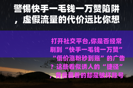 打开社交平台,你是否经常刷到“快手一毛钱一万赞”“低价涨粉秒到账”的广告?这些看似诱人的“捷径”,背后藏着的却是破坏账号安全、侵蚀平台生态的巨大陷阱,对于想要在快手成长的创作者来说,认清虚假流量的本质,远离违规平台,才是账号长久发展的唯一正道。