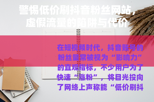 在短视频时代,抖音账号的粉丝量常被视为“影响力”的直观指标,不少用户为了快速“涨粉”,将目光投向了网络上声称能“低价刷抖音粉丝”的网站,这些看似诱人的服务背后,隐藏着违规风险、安全漏洞与长期发展的隐患,值得每一位内容创作者警惕。