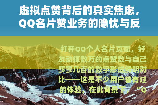 打开QQ个人名片页面,好友动辄数万的点赞数与自己寥寥几百的数字形成鲜明对比——这是不少用户曾有过的体验,在此背景下,“QQ名片赞业务”悄然兴起,成为部分人快速提升“社交人气”的“捷径”,这项看似简单的服务背后,却隐藏着合规风险、价值观扭曲等多重隐忧。