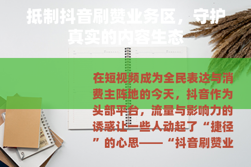 在短视频成为全民表达与消费主阵地的今天,抖音作为头部平台,流量与影响力的诱惑让一些人动起了“捷径”的心思——“抖音刷赞业务区”这类灰色地带悄然滋生,刷赞绝非通往成功的“快车道”,它不仅破坏平台生态,更会给创作者、用户乃至整个行业带来深远的危害。