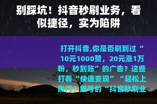 打开抖音,你是否刷到过“10元1000赞,20元涨1万粉,秒到账”的广告?这些打着“快速变现”“轻松上热门”旗号的“抖音秒刷业务”,正在悄悄收割急于求成的创作者——但你知道吗?这条“捷径”背后,藏着足以摧毁账号的深坑。