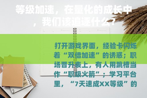打开游戏界面,经验卡闪烁着“双倍加速”的诱惑;职场晋升表上,有人用跳槽当作“职级火箭”;学习平台里,“7天速成XX等级”的标语总能抓住眼球……“等级加速”,这个原本诞生于游戏世界的词汇,如今已渗透到生活的方方面面——它是我们对成长速度的渴望,也是量化时代下,人们对“更快获得结果”的集体焦虑。