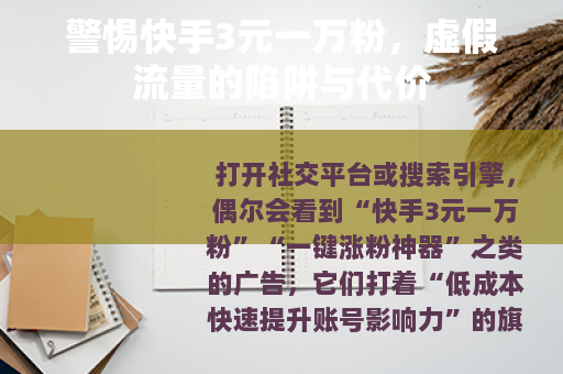 打开社交平台或搜索引擎,偶尔会看到“快手3元一万粉”“一键涨粉神器”之类的广告,它们打着“低成本快速提升账号影响力”的旗号,吸引着那些急于在快手平台获得关注的新手创作者或小主播,这种看似“捷径”的背后,藏着无数看不见的风险和代价。