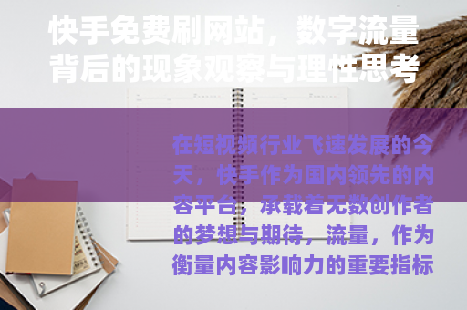 在短视频行业飞速发展的今天,快手作为国内领先的内容平台,承载着无数创作者的梦想与期待,流量,作为衡量内容影响力的重要指标,自然成为了许多人追逐的目标。“快手免费刷网站”这一关键词逐渐进入大众视野,引发了不少讨论,这些声称能免费提供点赞、粉丝、播放量的平台,究竟是创作者的“福音”,还是数字时代下的流量泡沫?让我们一起深入探讨。