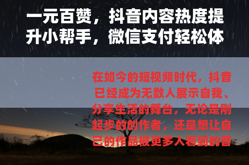 在如今的短视频时代,抖音已经成为无数人展示自我、分享生活的舞台,无论是刚起步的创作者,还是想让自己的作品被更多人看到的普通人,都在寻找能快速提升内容曝光度的方法,而“一元买100赞,微信支付即可完成”的服务,正逐渐成为不少用户的选择——它用极低的成本,为内容带来了初步的热度,也让更多人看到了创作的可能性。