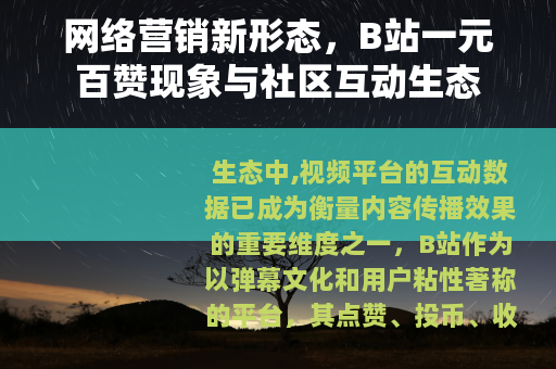生态中,视频平台的互动数据已成为衡量内容传播效果的重要维度之一,B站作为以弹幕文化和用户粘性著称的平台,其点赞、投币、收藏等互动行为,不仅反映用户对内容的认可,也影响着内容的推荐权重,近年来,网络上出现“一元一百个赞”等低价互动服务,这一现象背后,关联着内容创作生态、营销策略与社区规则之间的多重互动。