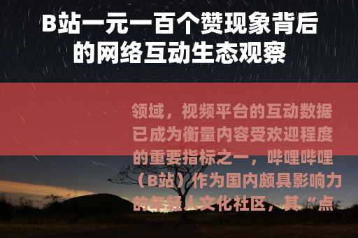 领域,视频平台的互动数据已成为衡量内容受欢迎程度的重要指标之一,哔哩哔哩(B站)作为国内颇具影响力的年轻人文化社区,其“点赞”功能是用户表达对创作者支持与认可的直接方式,近年来,网络上出现了所谓“一元人民币即可获得一百个B站点赞”的服务信息,这一现象折射出网络互动行为中某些值得关注的方向。