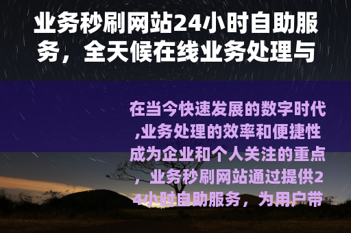 在当今快速发展的数字时代,业务处理的效率和便捷性成为企业和个人关注的重点,业务秒刷网站通过提供24小时自助服务,为用户带来了全新的在线业务处理体验,这种服务模式依托先进的互联网技术,允许用户在任意时间通过网站平台自主完成业务操作,无需依赖人工干预,从而实现了高效、灵活的业务支持。