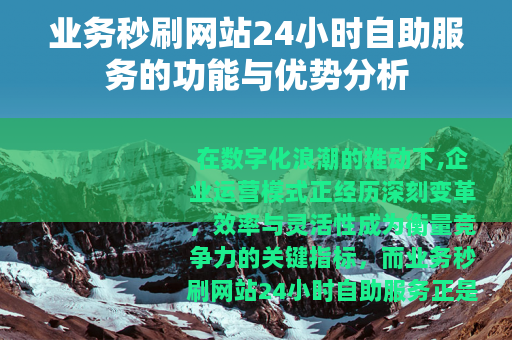 在数字化浪潮的推动下,企业运营模式正经历深刻变革,效率与灵活性成为衡量竞争力的关键指标,而业务秒刷网站24小时自助服务正是应此需求而生的创新工具,它通过自动化技术和全天候可访问性,帮助企业快速处理业务数据,优化工作流程,本文将系统介绍业务秒刷网站的核心功能、显著优势及实际应用场景,阐述其如何助力企业提升运营效能,适应快速变化的市场环境。